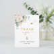 Una moderna y elegante ducha de bienvenida. Un fondo blanco moda. Decoradas con flores blancas, flores (peonía) y hojas de eucalipto de color verde acuático, estribos, vegetación y brotes de oro falsos. Letras negras y doradas. Al frente del texto: Gracias, nombre y fecha. Parte posterior: plantilla para su nota de agradecimiento y nombre.