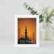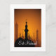 Una postal para la festividad de Eid con muchas mezquitas sobre las siluetas de fondo naranja con gradiente circular.