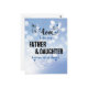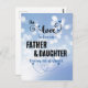 El amor entre padre e hija no conoce distancia en escritura mixta negra y azul y letras mayúsculas con adornos de pergamino y corazón. Está situado sobre un fondo azul pálido de dos tonos y de color negro.
