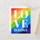 Esta postal del Orgullo Gay está decorada con LOVE IS LOVE en letras blancas en negrita sobre un fondo de arcoiris color agua de rojo, naranja, amarillo, verde, azul y morado. Acuarela original © Michele Davies.