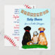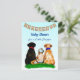 Invitaciones para una ducha de bebé. Niños pequeños y dos perros, un laboratorio negro y un laboratorio amarillo, con gorra de béisbol, guante de béisbol y béisbol, sentados juntos en el pasto. Este es un tema lindo para la ducha de bebé de un niño en primavera o verano.