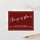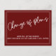 La parte frontal incluye un encabezado gráfico que diseñé usando una escritura informal, que dice "Cambio de planes". Más abajo, hay un mensaje alegre que puedes editar, que declara tu noticia: "¡Todavía nos estamos casando! Ahora mismo no estamos seguros de cuándo ocurrirá". Este texto, acentuado con dos bordes delgados, aparece en blanco. El fondo de la parte delantera es un rojo burdeos profundo; puede cambiarlo a cualquier color que prefiera, si desea un cambio. El reverso incluye marcadores de posición de plantilla para sus detalles. Utilice estos campos para añadir sus datos personales y cambiar mi texto de borrador para adaptarlo a sus necesidades y situación.