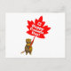 Un personaje de castor canadiense sostiene una hoja gigante de arce rojo que dice ¡Feliz Día de Canadá!