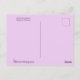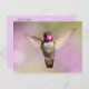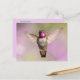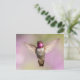 Postal con colibrí de anna en vuelo sobre un fondo violeta y verde, con las alas abiertas, mirando directamente a ti. Se pueden ver los detalles de sus plumas magenta rosa de garganta (gorget). Hermosa tarjeta para los amantes de las aves, el jardín y la naturaleza. Foto tomada en Arcadia, California.