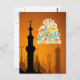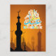 Una postal para la fiesta de Eid con colorida caligrafía de Eid Mubarak en árabe e inglés