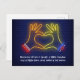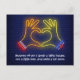 Gráfica en colores neones de las manos de una dama gestando un corazón con la frase "Por ti me río un poco más fuerte, lloro menos y sonrío mucho más".