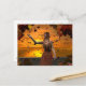 Una mujer elfo con el pelo largo trenzado rojo se levanta para atrapar una hoja que cae frente a una bella puesta de sol naranja.