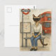 Esta encantadora postal cuenta con un gato siamés que espera pacientemente un autobús de dos pisos en el corazón de Londres. Con el icónico autobús rojo y el clásico telón de fondo londinense, este diseño capta la esencia de la vibrante vida urbana de Londres a través de los ojos de un gato. ¡Un lugar perfecto para los amantes de los gatos, los londinenses y los amantes del encanto británico!