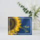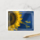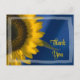 Personalizar el girasol amarillo bonito en azul Gracias Postcard con su propio mensaje personal de agradecimiento, aprecio y gratitud. Adecuado para usar para regalos recibidos después de un cumpleaños de verano o otoño, fiesta de compromiso, ducha de novia o boda. Esta elegante nota de agradecimiento botánico personalizado presenta una fotografía floral cercana de un girasol amarillo vibrante sobre un fondo azul.