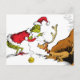 Esta divertida ilustración captura el momento preciso en que el Grinch decide que su perro necesita una mejora. El Grinch, vestido con su traje completo y difuso de Santa Claus, está atando meticulosamente un solo cuerno de reno en la cabeza de su perro, Max, usando un trozo de cuerda o hilo. Pobre Max parece totalmente resignado a su destino como el "reno reticente". Esta divertida y clásica ilustración destaca perfectamente el absurdo y travieso plan detrás del famoso robo de Navidad.