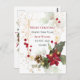 Este diseño presenta la composición de Navidades de Poinsettia, hojas verdes y doradas, cono de pino, garganta ligera y bayas rojas. En la parte superior de la tarjeta postal - efecto dorado confetti.