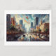 Se representa una concurrida calle urbana en Las Vegas, llena de gente y vehículos en medio de altos rascacielos y edificios icónicos. Las palmeras bordean la calle bajo un cielo vibrante y colorido.