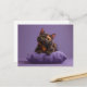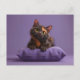 Un lindo personalizado negro y naranja tortoisesinfierno gatito se sienta cómodamente sobre un cojín morado contra un fondo morado.