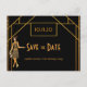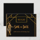 Elegante faux gold y glam para una fiesta de cumpleaños 50 (o de cualquier edad) inspirada en el estilo de los años 20. Una fiesta de cumpleaños al estilo Art Déco Salven la tarjeta de fecha en oro falso y negro para una glamurosa celebración. Decorada con un flapper chica de los años 20 y un marco de estilo art decó. Plantillas para una fecha y nombre/edad. Esta tarjeta también está disponible en nuestra tienda con un color de fondo blanco en la parte posterior. Sugerencia: Si no desea que se vea como una postal, haga clic en personalizar, vaya a la parte posterior y quite el separador y el sello postal.