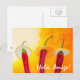 Bodegón de tres chiles rojos con sombreros hechos de limón y mandarina sobre el fondo texturizado de un día caluroso y soleado en México. Tarjeta postal. Tema de amistad divertida. Puedes cambiar o eliminar el texto de la plantilla ¡Hola, Amigo!