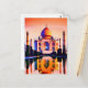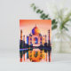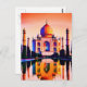 Tarjeta postal en una ilustración del Taj Mahal, reflejado en el agua, y respaldado por un profundo cielo de puesta de sol naranja coral
