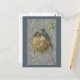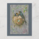 Un par de golondrinas han hecho un nido de barro en una pared adornada con olores. Hay un corazón dorado en el nido y otro colgando del cuello de uno de los pájaros en esta postal vintage de 1914.