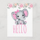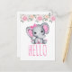 Una postal de hola con un bonito ilustracion de color elefante rosa. Ella tiene unas orejas puntiagudas rosadas y blancas de polka y un arco de cinta rosada en la parte superior de su cabeza. La parte superior está decorada con un bonito ramo de rosas.