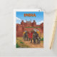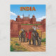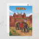 Se ven dos elefantes con jinetes frente a un gran e histórico fuerte indio, bañado por la luz del sol bajo un cielo azul claro.