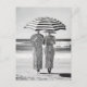 Dos mujeres están descalzas en la playa, vestidas con vestidos idénticos de rayas blancas y negras, creando una sorprendente armonía visual. Sostenían paraguas rayados y gorras a juego, mezclándose en el juego de patrones audaces contra el fondo del océano. Esta imagen surrealista y de alta moda captura simetría, contraste y estilo en una escena atemporal de la costa.