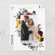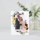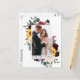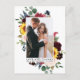 Elegante tarjeta postal de agradecimiento de boda con rosas burgundy y rosadas, flores azules, girasoles, vegetación botánica y hojas de eucalipto para la novia y el novio.