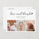 Esta elegante tarjeta de agradecimiento moderna para baby shower de 3 fotos personalizadas es una forma encantadora de agradecer a amigos y familiares por los regalos y el apoyo recibido durante su baby shower. El diseño minimalista y de moda presenta un collage de 3 fotos de su bebé en la parte inferior. En la parte superior hay un encabezado de "amor y gracias" en escritura a mano moderna, que termina con un pequeño corazón adorable y los detalles de su bebé están debajo en una fuente elegante. Su mensaje de agradecimiento totalmente personalizable está en la parte posterior. Haga clic en el botón de personalización para cambiar la tarjeta con su información.