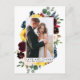Elegante tarjeta postal de agradecimiento de boda de novia y novio floral rosa borgoña acuarela y vegetación incluye rosas borgoña y rosadas, flores azules, girasoles, vegetación botánica y hojas de eucalipto.