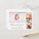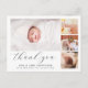Esta elegante y atemporal tarjeta de anuncio de nacimiento y agradecimiento con foto es ideal para cualquier persona que desee agradecer a sus invitados en el baby shower por los regalos, el amor y el apoyo que han recibido y para presentar al nuevo miembro de la familia. El diseño moderno y elegante tiene un estilo minimalista y cuenta con cuatro fotos personalizables colocadas en el collage, tipografía simple y elegante para su información, y una escritura elegante para un encabezado de "gracias". En el reverso, hay un mensaje de agradecimiento personalizable con sus nombres. Utilice el botón "personalizar" para reemplazar las fotos y editar el texto.