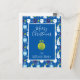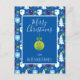 Elegantes Navidades 🤍 azules y blancos 🎄 carta de pickleball. Paddles de bolas de pickleball azules y blancas, árboles blancos de Navidad con baloncesto de árbol de navidad, copos de nieve sobre fondo azul oscuro de moda.