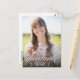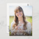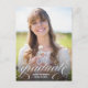 Esta elegante postal de graduación incluye caligrafía blanca bonito y una gran foto. La escritura blanca que se lee en la parte inferior dice "Graduado" en letras minúsculas decoradas con elegantes florecientes. Añada el nombre del graduado y el año de graduación al frente del diseño tipográfico. En la parte posterior de la tarjeta postal de graduación puede agregar un mensaje a los destinatarios y/o a la información de la fiesta de graduación.