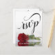 Esta postal RSVP presenta un diseño elegante con el título rsvp escrito en una hermosa caligrafía de escritura, y una sola rosa roja colocada en su lado reflejando en un charco de agua. Romántico, sofisticado y moda. La parte posterior es un formulario para que los clientes rellenen el formulario de aceptación o de envío de disculpas. Hay espacio para elegir la comida que prefieran e indicar el número total de clientes en su fiesta. También hay espacio para entrar en un sitio web para que sus invitados puedan responder en línea.