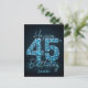 ¡Celebra 45 años con estilo con esta tarjeta postal de cumpleaños personalizable! El llamativo '45' brilla con elegantes piedras preciosas azules, reflejando una vida rica en experiencia y aventura. Un delicado guión rodea el número en negrita, añadiendo un toque refinado, mientras que la sección del nombre es totalmente personalizable para hacerlo verdaderamente personal. ¡Un diseño elegante y festivo perfecto para marcar este hito!