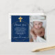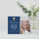 Agradece a amigos y familiares por asistir al bautizo de tu bebé enviándoles esta elegante tarjeta de agradecimiento de bautizo de niño con cruz dorada y fondo azul marino. Esta tarjeta de agradecimiento de bautizo para niño presenta una hermosa cruz dorada con un marco dorado sobre un fondo azul marino simple y elegante. Personaliza el texto y la fuente a tu gusto, que incluye el nombre de tu hijo, una nota personal, tu firma y tu dirección en el reverso de la tarjeta. Agrega una foto especial de tu bebé para un toque extra especial.