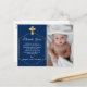 Agradece a amigos y familiares por asistir al bautizo de tu bebé enviándoles esta elegante tarjeta de agradecimiento de bautizo de niño con cruz dorada y fondo azul marino. Esta tarjeta de agradecimiento de bautizo para niño presenta una hermosa cruz dorada con un marco dorado sobre un fondo azul marino simple y elegante. Personaliza el texto y la fuente a tu gusto, que incluye el nombre de tu hijo, una nota personal, tu firma y tu dirección de remite en el reverso de la tarjeta. Agrega una foto especial de tu bebé para un toque extra especial.