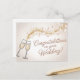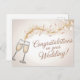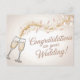 Una imagen elegante y celebratoria que presenta un hermoso diseño de tarjeta de felicitación. Muestra dos copas de champán brindando, acompañadas de una festiva lluvia de purpurina dorada y delicados pétalos. El texto "¡Felicidades por su boda!" está escrito en una elegante caligrafía fluida.