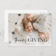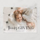 Envíe un sincero saludo de temporada con esta elegante postal familiar "Gracias por dar", que incluye su foto personal y texto personalizado. La tipografía de la moda y el diseño minimalista hacen que sea una manera atemporal de compartir gratitud con amigos y familiares. Impreso en cartón semi-brillante de alta calidad, esta postal es perfecta para enviar por correo sus deseos de Acción de Gracias con estilo.