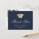 Elegante graduación de azul oscuro gracias a la postal que incluye una gorra de oro, "Gracias" en un guión formal de oro, y el nombre del graduado, el año escolar y de clase en tipografía clásica de yerba dorada. En la parte posterior, cargue una foto y personalice su mensaje de agradecimiento o deje en blanco una nota manuscrita si lo desea.