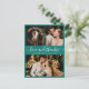 Moderna Y Elegante Mano Leyó A Jade Green Boda 3 Collage de fotos Gracias Postard. boda minimalista: plantilla de tarjeta de agradecimiento con tres fotos en la parte delantera y una en la parte posterior. Con el texto "Amor y gracias" en una letra de escritura tipográfica con letras a mano rápida con toques de color blanco sobre fondo de color verde jade. Pequeña forma de corazón entre los nombres. Personaliza tu nombre y mensaje de agradecimiento. Si prefiere escribir a mano la nota, simplemente elimine el texto de ejemplo para hacer más espacio. Si necesita ayuda o un elemento que coincida, por favor contáctame.