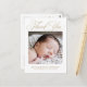 Tarjeta postal de agradecimiento para bebé con elegante caligrafía dorada que incluye tres fotos del nuevo bebé, junto con elegante caligrafía, y todos los datos del bebé. La parte trasera tiene espacio suficiente para tu nota de agradecimiento.