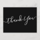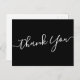 Elegante tarjeta postal negra de agradecimiento con el texto "gracias" a través de la tarjeta en un tipo de letra manuscrita blanca