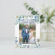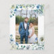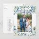 Alegres flores de peonía blancas y hojas de acuarela verde forman un hermoso borde alrededor de la foto del matrimonio en esta linda tarjeta postal de agradecimiento de boda floral azul de primavera. La escritura a mano chic y moderna está superpuesta en blanco en la fotografía de los recién casados. Agregue su mensaje personalizado de agradecimiento en la parte posterior.