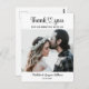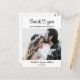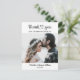 Una elegante foto personalizado personalizada diseño romántico boda para dar las gracias a todos los que enviaron sus felicitaciones y celebraron la unión de la pareja que acaba de casarse. El elegante diseño de recién casados es genial para agradecer a los que enviaron sus buenos deseos y asistieron a la celebración del boda o aniversario. Reemplace la imagen con una imagen horizontal de la novia y el novio. El texto del guión de caligrafía puede ser personalizado y personalizado con los nombres de la pareja. Puede cambiar el color de la fuente, el tamaño de la fuente y el tipo de letra. También puede cambiar el color del gráfico de agradecimiento utilizando la Herramienta de diseño. El diseño de apreciación especial es tuyo al personalizar y personaliza como quieras. El diseño minimalista se puede transferir a otros productos.