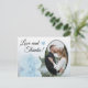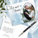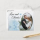 Esta hermosa postal es una forma sencilla y cuidada de agradecer a sus bodas invitados. Cuenta con un bonito diseño con la foto de su boda en forma de oval, y un único rosa polvoriento de color azul polvoriento de tallo largo reflejando en un estanque de agua. La leyenda dice "Amor y Gracias" y hay espacio para tu nota de personalizado en la parte de atrás así como tu firma.
