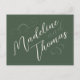 Lleve el sobre con este sencillo, único y elegante guión boda de respuesta rsvp POSTCARD, en verde musgo oscuro y crema, que ofrece un estilo vintage moderno, y está creado para coincidir con nuestra suite de invitados a la boda "Elegant Slant Script". El diseño presenta un sencillo fondo de color verde musgo oscuro en el frente con nombres de novia y novio de guión, y fondo crema con guión inclinado, dirección de retorno y acentos de giro verde salado en la parte posterior. Personalice fácilmente la redacción, y también puede editar la ubicación del texto o los componentes de diseño más adelante, haciendo clic en el botón azul "Editar usando herramienta de diseño" situado en la parte inferior de la ventana "Personalizar". Desplácese hasta la ficha "capas" de la columna de la izquierda de la pantalla de edición, seleccione la capa frontal o posterior y, a continuación, haga clic en el elemento que desea cambiar y hágalo propio. ¿Desea una tarjeta RSVP más formal + sobre? Sin más. Encontrar la versión formal de esta tarjeta rsvp en la colección de abajo. Asegúrese de comprobar TODOS los diseños de papelería coincidentes, como guardar la fecha, la invitación, la tarjeta de código QR del sitio web de rsvp, las tarjetas de gabinete de detalles, sobres de correo, bandas del vientre y más - ver la colección completa a continuación! Las solicitudes y preguntas de diseño personalizadas son siempre bienvenidas - haga clic en el botón "mensaje" o envíe un correo electrónico: contact@figandlilyco.com. El diseño es creado con cariño por Fig y Lily Studios (HH)