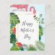 Una postal del Día de la Madre con un flamingo rosa lindo y caprichoso. Rodeado de hojas tropicales verdes y flores de hibisco rojas y amarillas. Marco de gradiente de oro cuadrado en el centro.