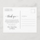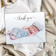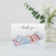 Elegante guión moderno de caligrafía recién nacido foto de bebé gracias postal. Presenta un hermoso texto de "gracias" en un guión de tipo de letra de tipo "swash tail" de caligrafía escrita a mano en gris. Al revés, un mensaje personal prefabricado en blanco y negro. Excelente para la ducha de bebé gracias y por el anuncio de nacimiento. Ideal para bebé o bebé. Fácil de personalizar con la foto y los detalles de su bebé.