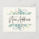 Tarjeta postal de anuncio de cambio de dirección/traslado con hermosas hojas de eucalipto verdes y follaje en crema para informar a amigos y familiares que se ha mudado.