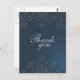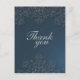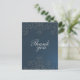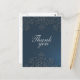 Esta elegante postal Boda de agradecimiento tiene un fondo azul marino oscuro con un diseño floral gris claro en la parte superior e inferior. En segundo plano, el diseño floral de los remolinos es anticuado. En el medio, gracias está escrito. Al fondo, puede personalizar el saludo. Esta combinación de colores clásica es ideal para cualquier temporada del año.