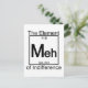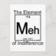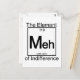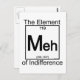 La ciencia ha aislado un nuevo producto químico en la tabla periódica - el elemento de indiferencia, abreviado como MEH. Esta sustancia común aparece como un encogimiento verbal de hombros cuando simplemente no te importa. Química argot para las masas, un regalo perfecto para... lo que sea.