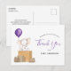 ¡Gracias a sus invitados por celebrar a la mamá! Esta postal de agradecimiento incluye un elefante acuarela con un globo violeta sentado en una pila de cajas de envío. Coincide con nuestra ducha de bebé elefante por correo. Personalice su información o haga clic en "Haga clic en el personalizar más adelante" para editar estilos de fuente, tamaño y colores.